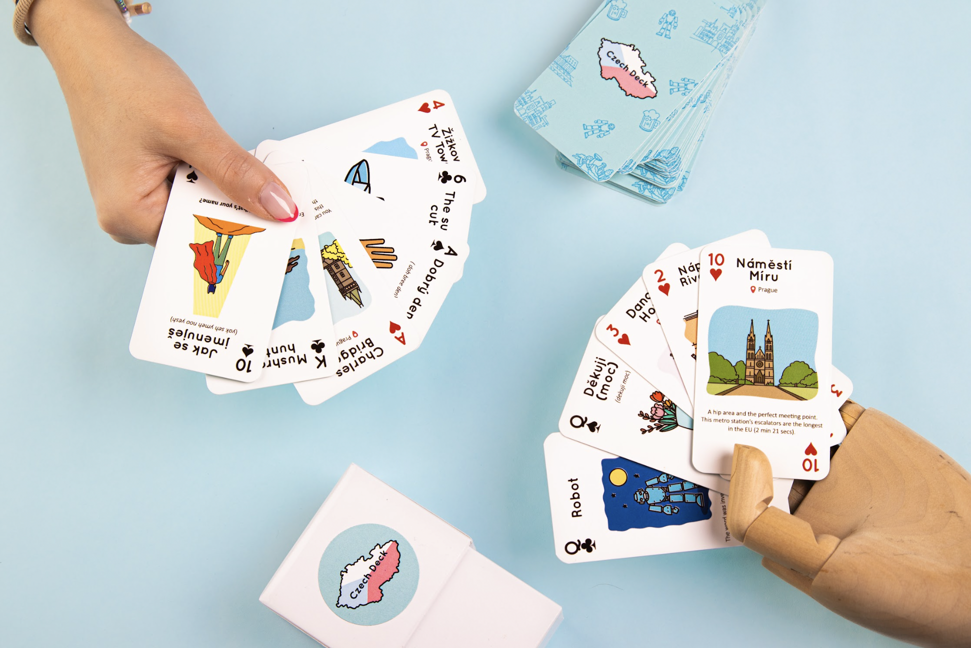 54 playing cards with a slide-down box that features local tips, phrases, fun facts, and hotspots across Czechia.